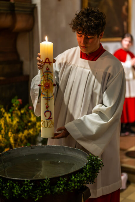 Die Feier beginnt im Freien oder am Eingang der Kirche mit der Segnung des Osterfeuers durch den Priester. Die Osterkerze, die das Licht Christi symbolisiert, wird an diesem Feuer entzündet. Das warme Licht flackert im Halbdunkel der Kirche und erhellt die Herzen der Gläubigen, die gespannt auf das kommende Geschehen warten. Die Osterkerze, Symbol für Christi Auferstehung und das Leben im Licht, strahlt eine tiefe Ruhe aus und verkündet Hoffnung inmitten der Dunkelheit. Ihr Flackern erinnert an die Worte des Exsultet, die feierlich in die festlich geschmückte Kirche hineinschwingen und die Atmosphäre der Osternacht mit festlicher Erwartung erfüllen. Das Anzünden der Osterkerze markiert den Auftakt zu einem spirituellen Erlebnis, das die Gläubigen auf eine Reise von der Dunkelheit zum Licht führt, begleitet von den traditionellen Riten und Klängen der Osternacht.
