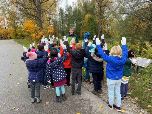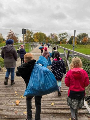 Foto: Umwelt- und Grünflächenamt  –  Die Kinder der Astrid-Lindgren-Schule stehen stellvertretend für die rund 1.000 Schul- und Kindergartenkinder von insgesamt fünfzehn Rosenheimer Schulen und Kindergärten, die sich dieses Jahr an den Herbst-Rama-Dama-Aktionen beteiligt haben.