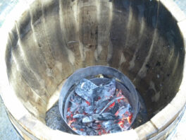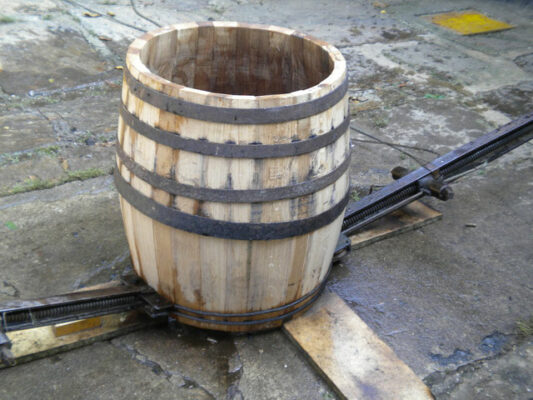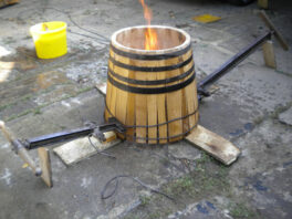 Dann folgt der wichtigste Schritt des Fassmachens – das biegen der Dauben. Hierfür werden weitere Eisenreifen auf die stehenden Bretter aufgezogen und in der Mitte des Fasses ein Holzfeuer entzündet, welches die Dauben biegsam macht. Wichtig ist dabei, dass die Bretter an der Außenseite laufen nass gemacht werden. Durch die entstandene Biegsamkeit werden die Dauben am anderen Ende mit Hilfe eines Fasszuges zusammengezogen. Danach wird das Fass gedreht und entsprechend bereift und darf erstmal abkühlen. Nach einem Tag Ruhepause kommt das Nachfeuer und Rösten auch Toasten genannt. Beim Nachfeuern werden die inneren Spannungen der Fassdauben minimiert und der Grad der Röstung (leicht/mittel/stark) bestimmt – diese beeinflusst später den Geschmack des gelagerten Gutes. Im vorletzten Schritt werden dann die Fassdeckel und -böden hergestellt und eingesetzt und zu guter Letzt wird das Fass noch gehobelt und geschliffen und das Spundloch gebohrt.