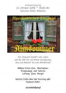 Am Kirchweihsonntag, den 21. Oktober, wird im Salvatorkeller in München ein alpenländisches Singspiel zum Thema Leben auf der Alm ausgerichtet. Der Müllner-Peter-Chor, der Montinichor, Dreigesänge und Solisten gestalten unter der Leitung des Kirchenmusikers Hans Berger den Abend. Beginn ist um 18:00 Uhr. Weitere Informationen gibt es unter www.festring.de.