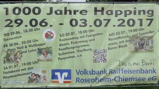 In Happing bei Rosenheim wird bald gefeiert, Anlass sind „1000 Jahre Happing“ und „50 Jahre Eingemeindung“. Der Bürger-Verein Happing freut sich dieser Tage vieler fleißiger Helfer, die das Fest im Festzelt vom Donnerstag, 29. Juni bis Montag, 3. Juli vorbereiten. Am Festsonntag sind ab 10 Uhr ein Festgottesdienst, anschließend ein Festzug und ab 13 Uhr ein Familienprogramm.