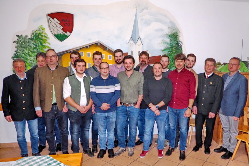 Bericht und Bild: Martin Aerzbäck – Freuen sich auf das 150. Jubiläum im April: Stadtbrandrat Hans Meyrl (rechts) sowie die Führungsriege der Feuerwehr Pang und die beförderten Kameraden mit (von links) Zweitem Vorstand Franz Schwaiger, Schriftführer Christian Wylezol, Zweitem Kommandant Ludwig Guttenberger, Michael Brummer, Marinus Stein, Peter Dinzenhofer junior, Andreas Hummel, Martin Daxlberger, Adrian Stadler, Vorstand Thomas Fischbacher, Florian Schießl, Franz Kaffl junior, Christian Scholz, Josef Kuchler und Kommandant Günter Scholz.