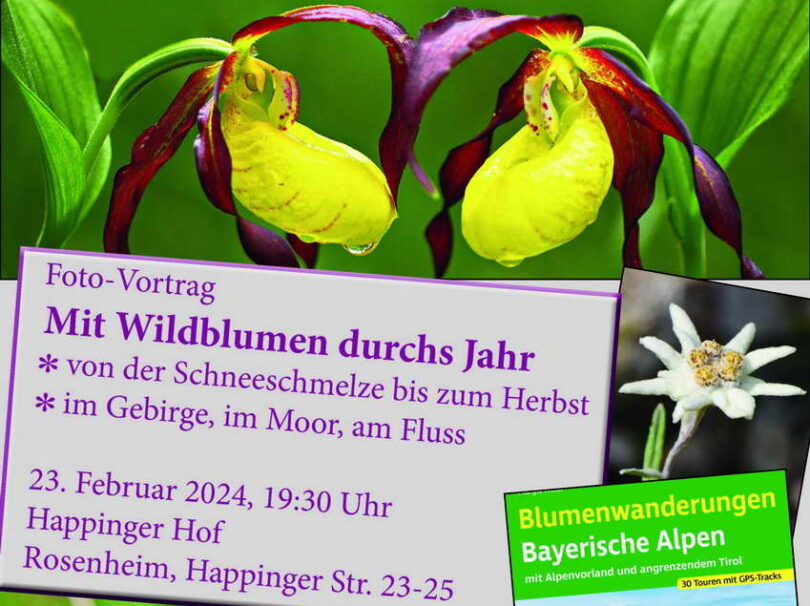 Der „Einfallsreichtum“ der Natur, mit dem sich filigrane Pflanzen im unwirtlichen Lebensraum Gebirge behaupten, ist nahezu unbegrenzt. Die kunterbunte Blumenpracht bereichert jede Wanderung – von der Schneeschmelze im Frühling bis weit in den Spätherbst. In einem bunten, abwechslungsreichen Foto-Vortrag nimmt uns die Autorin Margit Hiller mit durch das Blumenjahr: 23.2.2024 / 19:30 Uhr im Happinger Hof, Happinger Str. 23-25, 83026 Rosenheim-Happing.