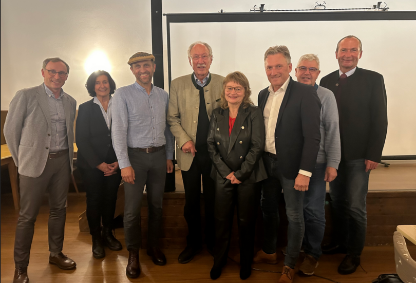 Gruppenfoto: u.a. mit den beiden LEADER LAG Chefs Bgm Andreas Bratzdrum ,Tittmoning,Vorsitzender (3.v.r) und Bgm Hans Jörg Birner ,Kirschanschöring (3.v.l),Stellvertreter, sowie Gastgeber Bgm Robert Moser ,Kirchweidach (1.v.r) und LEADER LAG Managerin Elke Ott (4.v.r)