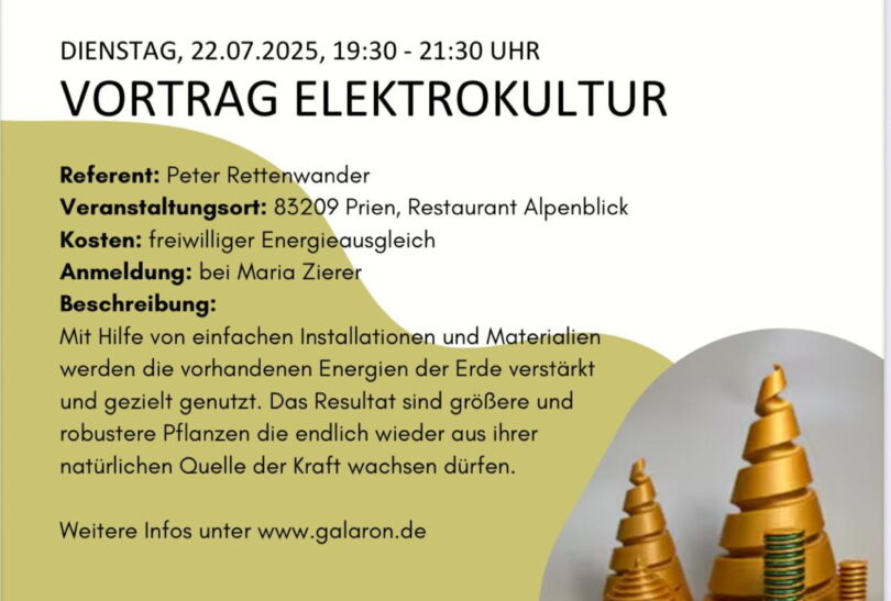 Zu eine Vortrag über Elektrokultur wird am Dienstag, 22. Juli in das Restaurant Alpenblick am Priener Sportpark eingeladen. Beginn ist 19.30 Uhr – Dauer bis ca. 21.30 Uhr.
