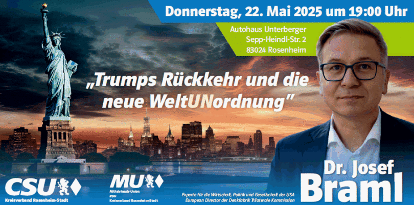 Die Mittelstands-Union Rosenheim-Stadt veranstaltet einen hochaktuellen Vortrag des renommierten USA-Experten Dr. Josef Braml am Donnerstag, 22. Mai 2025 um 19 Uhr im Autohaus Unterberger, Rosenheim.