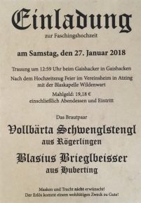 Gemeinsam veranstalten am Samstag, 27. Januar zugunsten eines wohltätigen Zweckes die Trachtenvereine von Wildenwart und Atzing zusammen mit dem Förderverein „Vereinshaus Atzing“ eine Faschingshochzeit. Das Brautpaar „Vollbärta Schwenglstengl aus Rögerlingen“ und „Blasius Brieglbeisser aus Huberting“ bereiten sich derzeit auf diese nur alle paar Jahrzehnte vorkommende Faschingsereignis vor. Ab sofort beginnt der Kartenvorverkauf (Mahlgeld 19,18 Euro einschließlich Abendessen und Eintritt) für Jedermann bei Anna Boggusch in Siggenham, Telefon 08051-92692. Die närrische Hochzeit in Schwarz-Weiß (keine Masken, keine Trachten) beginnt um 12.59 Uhr beim Gaishacker-Bauern in Prien-Gaishacken. Es folgen ein Hochzeitszug zum Vereinsheim in Atzing mit der Blaskapelle Wildenwart und anschließend die Hochzeitsfeier mit Tanz.