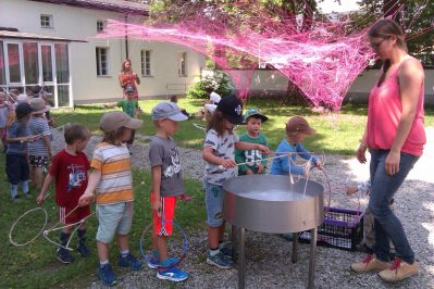 Anschließend stärkten wir uns im Garten unter einem großen kunstvollen Spinnennetz und genossen dort gemeinsam unsere Brotzeit. Besonders viel Spaß hatten die Kinder bei der Herstellung von Riesenseifenblasen.