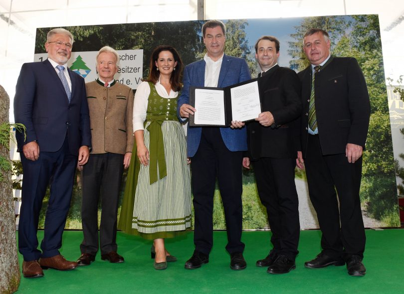 Vor 1 200 Waldbesitzern und Vertretern der Branche haben Ministerpräsident Dr. Markus Söder und Forstministerin Michaela Kaniber auf der Internationalen Leitmesse INTERFORST gemeinsam mit den forstlichen Verbänden einen „Waldpakt“ unterzeichnet. Der Ministerpräsident würdigte den Pakt als „Meilenstein für die Waldbesitzerinnen und Waldbesitzer in Bayern.“ Söder: „Bayern ist deutsches Waldland Nummer 1. Rund 2,6 Millionen Hektar Wälder prägen die bayerische Landschaft, aber auch unser Brauchtum und unsere Kultur. Die bayerischen Waldbesitzer und Waldbauern leisten einen maßgeblichen Beitrag für das unverwechselbare Gesicht des Freistaats. Ihre Arbeit ist für unsere intakte Natur und den Erhalt und die Pflege der wunderschönen bayerischen Landschaften unverzichtbar.“ Laut Kaniber soll der Waldpakt als partnerschaftlicher Kompass und Richtschnur dazu beitragen, die Zukunft der Wälder in Bayern zu sichern. „Der Wald mit seinen vielfältigen, unverzichtbaren Schutz-, Nutz- und Erholungsfunktionen ist ebenso wie der Rohstoff Holz ein fester Bestandteil unserer bayerischen Identität“, so die Ministerin. Angesichts der großen Herausforderungen durch Klimawandel und demografische Entwicklung werde die Staatsregierung den öffentlichen und privaten Waldbesitzern auch künftig verlässlich zur Seite stehen.