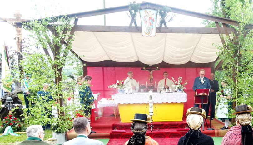 Und natürlich eich, liebe Chiemgauer Trachlterinnen und Trachtler fürs mitfeiern des Gottesdienstes. Bevor wir am Soldatengrab den Verstorbenen und vermissten Trachtler gedenken, darf ich Hr. Pfarrer Steindlmüller noch um den Segen bitten. Vergelt’s Gott allen fürs zuba kemma. I wünsch eich ollen noch an schönen Christi Himmelfahrtstag.
