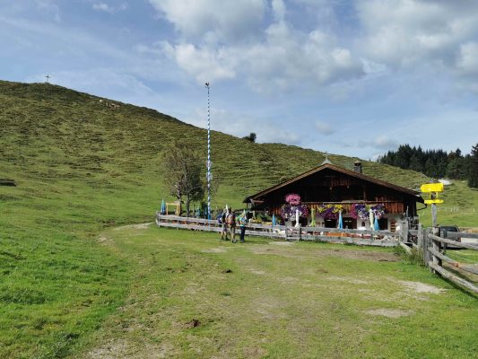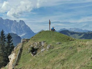 Nachdem wir die schöne Aussicht (u.a. auf die Loferer Steinberge, die Steinplatte, das Fellhorn und den Wilden Kaiser) genossen haben, steigen wir auf dem gleichen Weg wieder zur Forststraße hinunter. Nach wenigen Minuten weist bei einem Teich ein Schild rechts zur Huberalm, die wir alsbald erblicken. Bevor wir jedoch zur Alm absteigen, lohnt sich der kurze Aufstieg auf das pyramidenförmige Huberkreuz (1146 m). Etwas trittsicher und leicht schwindelfrei sollte man hierzu allerdings sein. Dann lassen wir uns bei der Huberalm eine Brotzeit schmecken, während wir gleichzeitig den Ausblick auf das Kaisergebirge auf uns einwirken lassen. Mit etwas Glück sind die “Huberalm Dirndl’n” anwesend und sorgen für die musikalische Unterhaltung.
