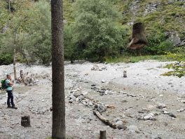 Vom Parkplatz aus folgen wir der Beschilderung zur Grießbachklamm. Zunächst geht es ohne wesentlichen Höhengewinn am Grießbach entlang, nach einiger Zeit, in der Klamm, steigt der Weg mäßig an. Der schattige, mitunter feuchte Weg durch die wildromantische Klamm ist gut verbaut, und bald müssen wir mehrere lustige Hängebrücken zwischen den Feldwänden überqueren. An einigen Engstellen gibt es geländerlose Stege. Immer wieder begleitet uns das Rauschen des Wildbaches. Nach einem Wasserfall weitet sich das Bachbett. Hier stehen auf Sandbänken hunderte von großen und kleinen Steinmännern, wo auch Kinder gefahrlos spielen und plantschen können.