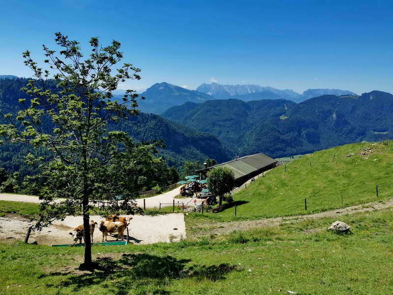 Der weitere Weg führt zunächst wenige Meter der Straße folgend in Richtung der bereits sichtbaren Aderbergalm (bekannt vom gleichnamigen Werbespot). Aber nach wenigen Metern verlassen wir die Straße rechts auf einen steilen Wiesenweg, der uns hinauf zu einem Sattel führt. Bei einer Kreuzung mit Wegweiser halten wir uns rechts, gehen kurz am Waldrand entlang und zweigen bald links und wieder bergab in den Wald ab (Wegweiser stand Juli 2022 nicht vorhanden). Dieser schöne, schattige Steig führt uns in ca. 20 Minuten zur Jochbergalm mit seinen alten Widholzerkasern. Wir lassen uns die Almbrotzeiten und die kühlen Getränke schmecken, während unser Blick immer wieder hinüber zum Gurnwandkopf und der Hörndlwand schweift. Weiter hinten stehen die Reifelberge und das Sonntagshorn.