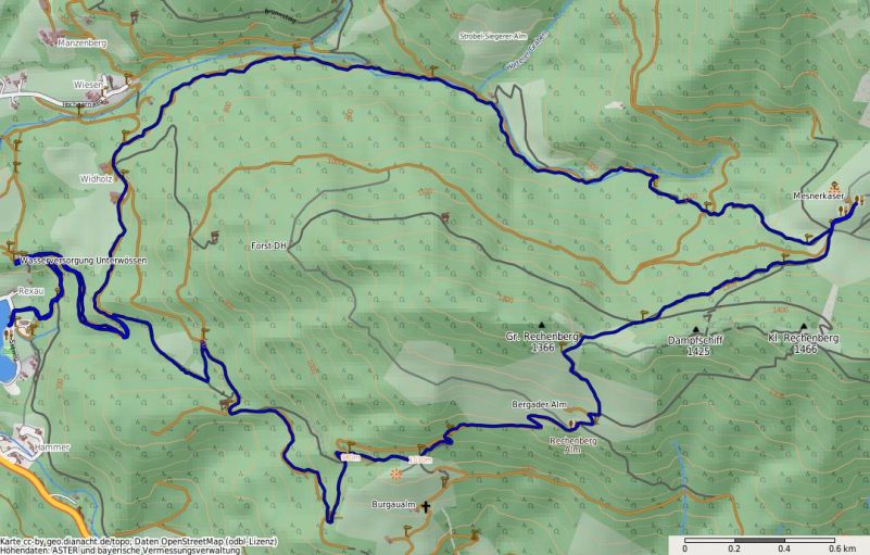 Gleich zwei attraktive, urige Almen mit noch echter bayerischer Gastlichkeit treffen wir auf dieser Wanderung unterhalb des Rechenbergs an. Einerseits die Rechenbergalm mit ihrem herrlichen Blick auf Oberwössen und die fernen hohen Tauern, andererseits das kleine Almdorf der Jochbergalmen mit der Aussicht auf Hörndlwand, Gurnwandkopf und das Sonntagshorn. Einsam wird man hier an schönen Wochenenden sicher nicht bleiben, aber die noch echte bayerische Gastlichkeit, die man oft nicht mehr antrifft, ist allein schon den Besuch wert. Zum Abschluss der Tour lädt an heißen Sommertagen ein Sprung in den Wössener See ein.