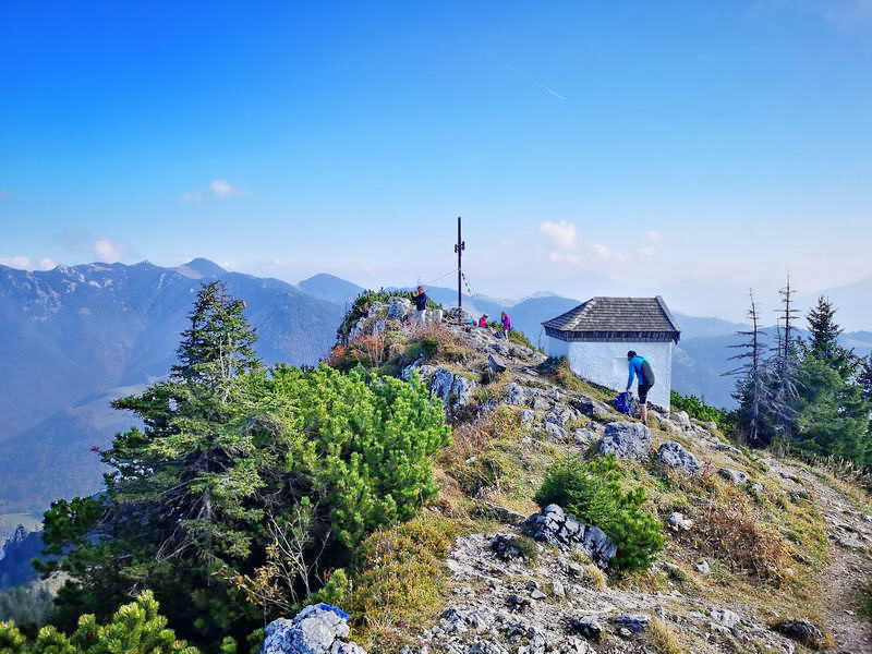 Hinunter geht es nun über den Normalweg in südlicher Richtung. Kurzzeitig etwas steil, durchqueren wir den bewaldeten Hang und stehen bald vor der Altkaseralm bzw. dem Spitzsteinhaus. Um weiter abzusteigen, halten wir uns nach Osten und steigen dabei kurz auf. An der höchsten Stelle, direkt bei der Aueralm, mündet dann von links der Weg ein, der von der Gabelung hierher führt, die wir vor der Nordwand passierten. Ab hier geht es wieder bergab, wobei der Weg zuerst nach und nach schmäler wird, um später wieder in einen breiten Weg aufzugehen. Nach einer guten Stunde stoßen wir schließlich in einer Höhe von 800 Meter auf unseren Aufstiegsweg. In diesen biegen wir rechts ein und sind nach kurzer Zeit wieder an unserem Ausgangspunkt.