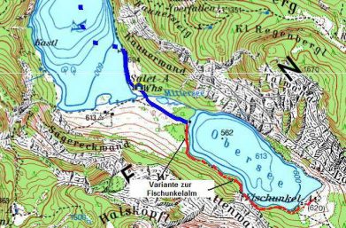 Startpunkt ist der Königssee-Wanderparkplatz in Schönau. Von der Anlegestelle Salet folgen wir dem breiten Wanderweg entlang des Sees bis zur Gaststätte Saletalm. Um zum Obersee zu gelangen, gehen wir weiter über die Brücke des Saletbaches. Wir passieren den kleinen Mittersee, bewundern die vielen Brombeersträcher am Wegesrand und erreichen schließlich das Westufer des Obersees (25 Min., 10 Höhenmeter). Der Weg zur Fischunkelalm führt über Stock und Stein und erfordert deshalb entsprechend festes Schuhwerk! Am Westufer des Obersees folgen wir rechterhand der Beschilderung zur Fischunkelalm. Unser Weg ist fast durchwegs schattig, steigt über Steintreppen leicht an und führt nach Überwindung der Erhebung hinunter zur 500 Jahre alten Fischunkelalm. Dort gibt es einfache Almbrotzeiten wie frische Milch, Almbutter, Brot, Käse oder Speck. (30 Min., 30 Höhenmeter). Wer jetzt immer noch nicht genug hat, kann in einer weiteren halben Stunde auf einem leichten, etwas ansteigenden Wanderweg von der Fischunkelalm aus den Röthbachfall erreichen. Dieser stürzt aus fast 500 m Höhe hinab in den Talboden.