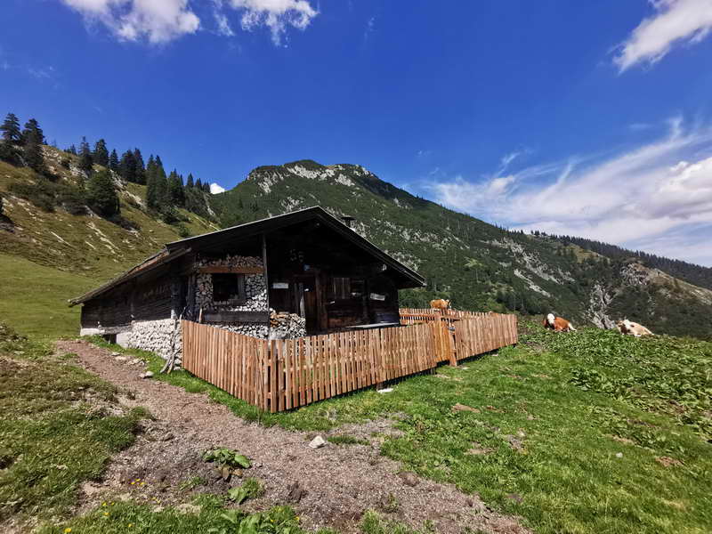 Im weiteren Verlauf halten wir uns ab dem Gipfel in westlicher Richtung über den flachen Grashang in Richtung Frechjoch (1788 m), ein kleiner Hügel, welcher den Übergang zwischen Veitsberg und Thalerjoch bildet. Etwa im tiefsten Punkt zwischen Veitsberg und Frechjoch biegen wir links in das Kar hinein, nun folgen wir dem Weg in südöstlicher Richtung bis zur Riedebenalm. Bei dieser halten wir uns und folgen dem Wegweiser “Riedenberg” (Weg rot-weiss-rot markiert). Der Steig führt meist durch schattigen Wald, verläuft mal steiler, mal flacher und quert auch einmal eine Forststraße. Im Talgrund des Längstals angekommen, trifft der Weg auf die Forststraße. Hier halten wir uns zunächst links und bei der Gabelung nach wenigen Minuten rechts. Dann bleiben wir auf der Forststraße, bis wir ohne großen Höhenunterschied in einer halben Stunde den Parkplatz erreichen.