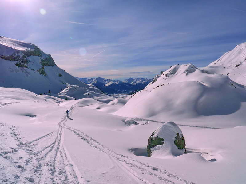 Landschaftlich ist diese beliebte Halbtagestour schon beim Aufstieg ein Traum. Manche bezeichnen sie als die schönste Ski-/Schneeschuhtour im Rofan. Größtenteils ist sie als leicht einzustufen, mal ist sie recht sacht, dann wieder etwas steiler, letzteres insbesondere beim Gipfelaufstieg. Doch stehen wir erst auf dem Gipfel, dann ist die Aussicht wirklich außergewöhnlich: Direkt in der Nachbarschaft, schon beim Aufstieg zum Gipfel imposant, die Nordabstürze der Hochiss, der höchsten Erhebung im Rofan. Auf der anderen Seite fallen die Nordwände der Rofanspitze ebenfalls mehrere Hundert Meter nahezu senkrecht zu Tal. Aber damit nicht genug: Vor uns liegt fast das ganze Rofangebirge mit seinen vielen Zacken, die ringförmig über die hügelige Hochfläche angeordnet sind. Und in der Ferne erblicken wir die Bayerischen Voralpen, die Kitzbüheler, Zillertaler und Tuxer Alpen, das Karwendel usw. – bei guter Fernsicht wirklich ein schönes Erlebnis.
