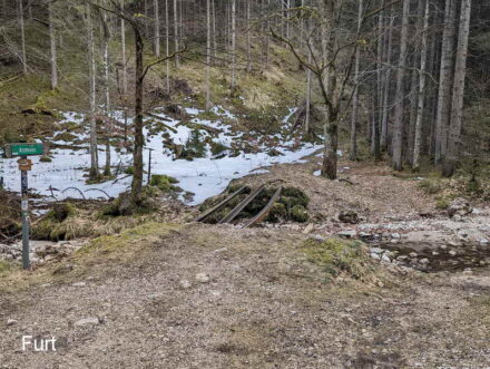 Ab dem Wanderparkplatz bleiben wir ca. 10 Minuten in südlicher Richtung auf der Straße. Am Waldrand biegen wir rechts ab und nach 40 Metern bei einer Gabelung nochmals rechts, Die Abzweigungen sind jeweils beschildert (“Breitenberghaus /Mitteralm”). Nun geht es kurzzeitig durch einen lichten Wald auf der Forststraße recht steil aufwärts. Bald wird es wieder flacher, die Abzweigung zum Breitenberghaus lassen wir rechts liegen. Eine halbe Stunde danach queren wir die Wendelstein-Zahnradbahn durch eine kleine Unterführung. Nun steigen wir moderat durch den lichten Wald empor und bleiben meist in Sichtweite der Zahnradbahn und des links verlaufenden Mühlbachs. Ca. 30 Minuten nach der Unterführung erreichen wir – noch vor der Bahnstation Aipl – den sog. “Schwarzen Ursprung”, ein Quellgebiet mehrerer Bäche. Hier verweist linker Hand ein altes Schild zum Arzmoos, daneben führen Stahlbalken einer verfallenen Brücke über den Bach, und rechts daneben gibt es eine Furt (siehe Bild). Meist kann man den Bach einfach überqueren, im Winter oder bei viel Wasser müsste man geschickt über die alten Stahlbalken balancieren. Danach beginnt ein knapp halbstündiger, steilerer Aufstieg durch den bewaldeten Nordhang des Butterberges. Der Weg wendet später nach links und bald erreichen wir ein flaches Gelände mit der Kronberger Alm. An ihr vorbei wandern wir zwischen ein paar Bäumen hindurch und stoßen bald auf ein breites Gatter.