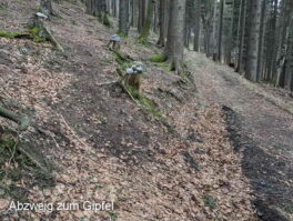 Hier beginnt der Aufstieg zum Schortenkopf. Es gibt weder Markierungen noch einen Wegweiser. Links vor dem Gatter führt ein breiter, oft matschiger Karrenweg mit tiefen Furchen bergauf. Auf diesem steigen wir ca. 340 Meter empor. Dann zweigt rechts ein schmaler Weg ab. Auch hier gibt es keine Markierung, aber mehrere kleine Steinmänner (siehe Bild “Abzweigung Steig zum Gipfel”). Der Steig, immer wieder durch Steinmännchen markiert, verläuft direkt dem Gipfel entgegen. Kurz vor dem höchsten Punkt wenden wir nach rechts und stehen plötzlich vor dem Gipfelkreuz. Vorsicht, hier geht es steil nach unten!