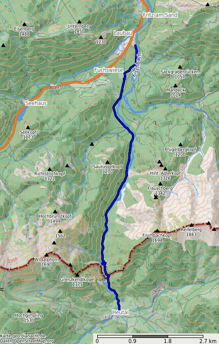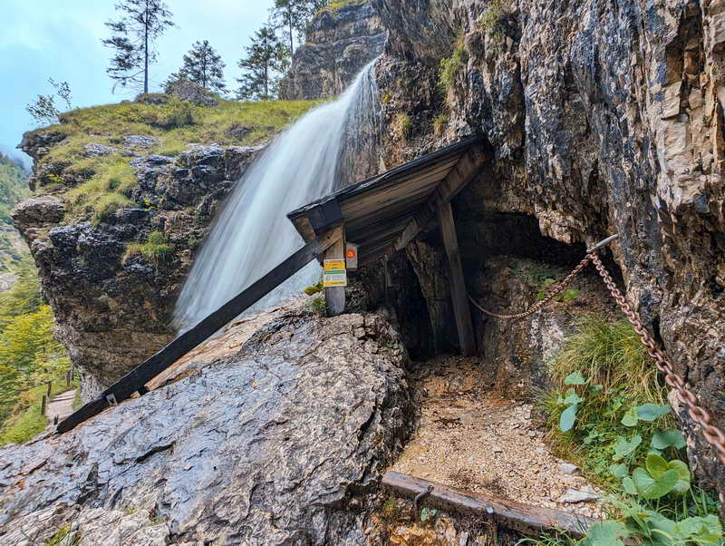 Vom Parkplatz beim Holzknechtmuseum folgen wir zunächst dem asphaltierten Wanderweg. Nach wenigen Minuten biegen wir rechts in Richtung Fuchswiese ab und halten uns kurz darauf links. Schon hier zeigt sich der direkt vor uns liegende Saurüsselkopf in seiner ganzen Pracht und ragt steil empor. Nach etwa 2,5 Kilometern zweigen vor und nach einer Brücke mehrere Straßen nach rechts ab. Wir nehmen die Abzweigung etwa 100 Meter nach der Brücke, die durch Schilder geradeaus zum Staubfall weist. Ein längerer Wegabschnitt, der meist dem Verlauf des Fischbachs folgt, liegt nun vor uns. Nach einer gesamten Gehzeit von etwa 1,5 Stunden erreichen wir das Ende der Forststraße, die bis hierher auch als offizielle Mountainbikestrecke genutzt werden kann. Hier beginnt der Steig, der laut Wegweiser in etwa 25 Minuten zum Staubfall führt. Der Pfad gewinnt schnell an Höhe und bringt uns zum Staubbach, der aus einer Steilwand als Staubfall in die Tiefe stürzt und unten in den Fischbach mündet. Ein gesicherter, mit einem Holzverschlag überdachter Weg führt direkt unter dem Wasserfall hindurch.