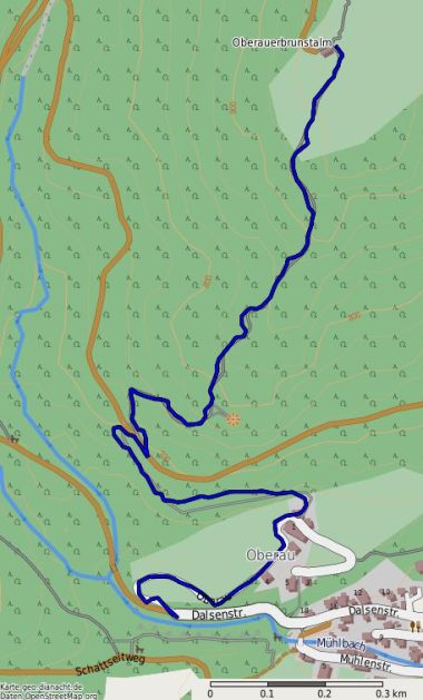 Startpunkt ist der Wanderparkplatz am Beginn des Dalsenbachtals bei Mühlau, zu erreichen über Grassau nach Marquartstein und von hier aus in Richtung Schleching. Noch vor Schleching, hinter Mettenham, am Schild “Mühlau 1 km” rechts ab. Durch den Ort (auch hier Parkplätze) und an der Gabelung rechts auf der Dalsenstrasse ins Tal zu den Parkplätzen.