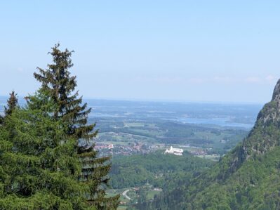 Wir erreichen die Gebäude der Schachenalm, die nicht bewirtschaftet ist. Der letzte Anstieg ist kurz, aber lohnend. Oben angekommen begrüßt uns ein großes Gipfelkreuz, davor eine Bank mit grandiosem Panorama. Die Sicht reicht weit – über grüne Täler, Wälder und schneebedeckte Gipfel am Horizont. Wir lassen uns Zeit, genießen Brotzeit und Aussicht, bevor wir für den Rückweg den etwas längeren, aber nicht ganz so steilen Weg hinunter nach Huben nehmen und dann auf dem Radweg zurück zum Auto wandern..