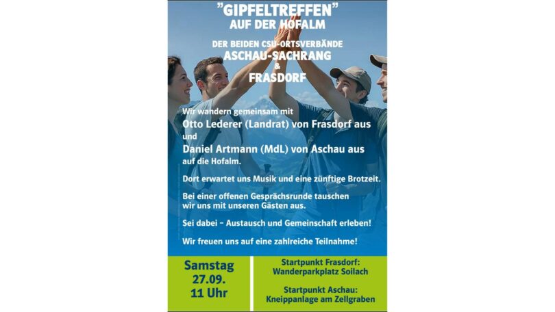 Am Samstag, den 27. September, laden die CSU-Ortsverbände Aschau-Sachrang und Frasdorf zu einem besonderen „Gipfeltreffen“ auf die Hofalm ein. Gemeinsam mit Landrat Otto Lederer (von Frasdorf) und dem Landtagsabgeordneten Daniel Artmann (von Aschau) wandern die Teilnehmer von zwei Startpunkten aus zur Hofalm.