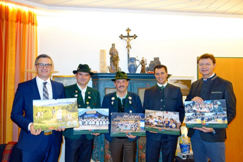 Nachhaltige Eindrücke und einmalige Bilder hat das im Sommer in Prien-Atzing beim Trachtenverein „Daxenwinkler“ stattgefundene 81.Gaurachtenfest des Chiemgau-Alpenverbandes hinterlassen. Ein Dutzend ausgesuchter Fotos hat der Verein nunmehr in einem Wand- und Gaufest-Kalender 2018 festgehalten. Die ersten drei Exemplare überreichten der vormalige Vorstand Anton Hötzelsperger und sein Nachfolger Michael Schlosser (zugleich Festleiter vom Gaufest) an den Schirmherrn Bürgermeister Jürgen Seifert von der Marktgemeinde Prien sowie an den Priener Sparkassen-Geschäftsleiter Alexander Hagenbrock und an den Geschäftsführer der Volksbank Raiffeisenbank Rosenheim-Chiemsee in Prien Christian Denk. Dabei bedankten sich die Atzinger Trachtler für die erfahrene Unterstützung bei den Vorbereitungen, bei der Werbung und bei den Veranstaltungen. Bürgermeister Seifert sowie die beiden Priener Banken-Chefs ihrerseits lobten den Trachtenverein, die weiteren Ortsvereine und die ganze Ortsgemeinschaft für den einzigartigen Zusammenhalt, der das Gautrachtenfest zu einem vollen Erfolg werden ließ.
