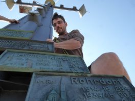 Foto: Herbert Reiter: Paul Kink  vor eineinhalb Jahren in Höhenberg beim Cafe Pauli mit einer 1,80 Meter hohen Nachbildung des Kampenwandkreuzes