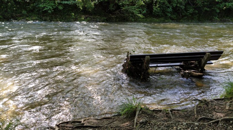 Der starke Regen hat in den letzten Tagen für vermehrtes Wasser in der Prien gesorgt. Stellenweise trat dabei das kleine Flüsschen über die Ufer wie zum Beispiel im Priener Eichental nahe der Brücke zum Schützenwirt. Unsere Aufnahme zeigt eine Wasser-Bank, die vorher eine Ruhebank war und auch wieder eine solche werden wird.