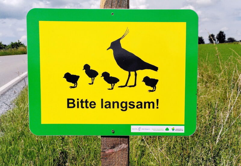 Insgesamt stehen sieben solche Schilder an viel befahrenen Straßen im Landkreis und machen auf Kiebitz-Familien aufmerksam, die diese Straßen überqueren. Bild: Landratsamt Rosenheim / Margit Böhm.