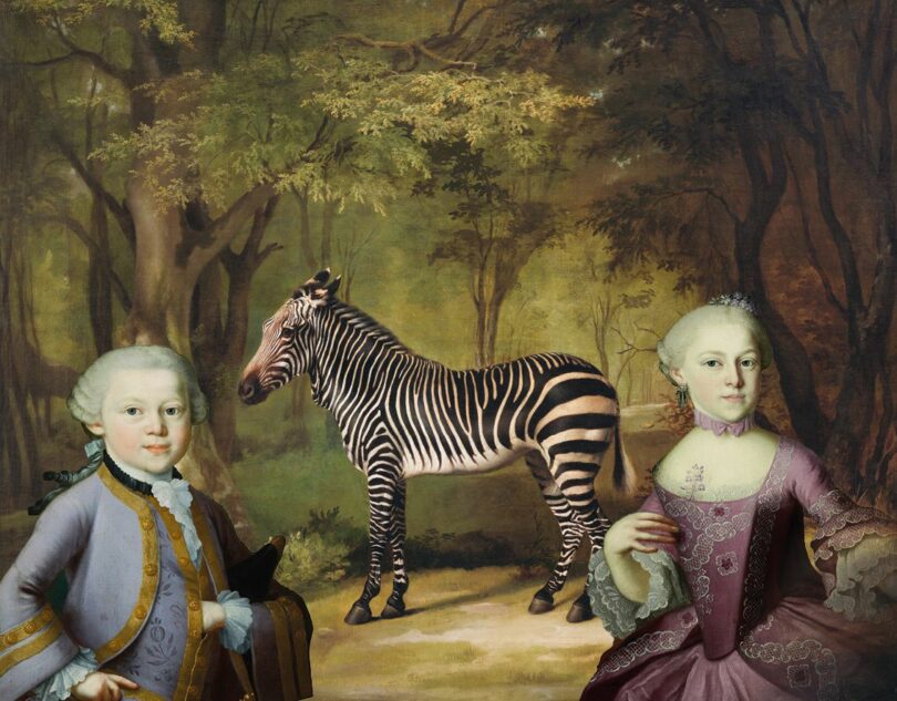 Plakat: Wolferl und Nannerl Mozart mit Zebra, Collage © ISM Salzburg / Yale Center for British Art, Paul Mellon Collection / Museum Wasserburg