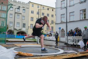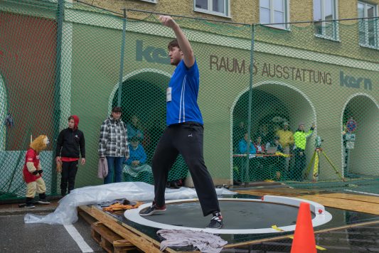 So rückte Fokus voll und ganz auf die stärksten und athletischsten Männer, dem Kugelstoß Hauptwettkampf. Der Dj heizte den Athleten richtig ein und so konnte der Favorit Christian Zimmermann vom Kirchheimer SC gleich zu Beginn mit 18,85m eine starke Weite vorlegen, welche bis zum Ende bestand hatte. Lukas Koller von der LG Stadtwerke München kam, mit für ihn persönlicher Bestleistung von 17,61m noch am nächsten. Seinen Abschied vom Leistungssport Kugelstoßen feierte der Wasserburger Robert Dippl in der Altstadt. Er stieß bei seinem letzten Wettkampf noch einmal 17,15m und konnte sich so den dritten Platz sichern. Sein größter Erfolg der Karriere war der Gewinn des Deutschen Meistertitels in der U23 und der Vizetitel bei den Männern. Robert war an diesem Tag locker drauf, genoss den Tag und dankte zum Schluss des Wettkampfes noch seinen Eltern und Trainern Joachim Lipske und Alfred Schuhbeck welche ihn über 20 Jahre gefördert und begleitet haben.