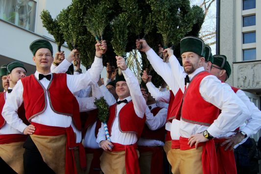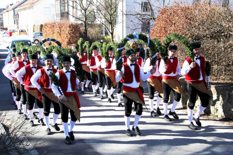 Nach einen Wochenende Tanzpause starteten die Wasserburger Schäffler letztes Wochenende, diesmal bei herrlichen Wetter so das man eher ” aber Heid is warm” als “Heid is koid” singen konte. So war es kein Wunder wenn bei den verschieden Auftritten ganze Scharen von Zuschauern teils mehrere Hundert den Tanz der Wasserburger Schäffler natürlich begleitet von der Wasserburger Stadtkapelle bestaunten. So wie im Mittelalter nach der Pest die Schäffler den Bürgern wieder Mut und Zuversicht und Aufheiterung brachten, so gelingt es auch in der heutigen Zeit die Leute auf die Straße zu bringen und ein lächeln ins Gesicht zu zaubern. Die Fotos entstanden beim Ehrentanz bei der evangelisch Christuskirche in Wasserburg wo die Schäffler auch als hervorragende Sänger ihr Schäfflerlied sangen.