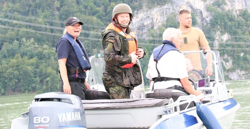 Dieser Tage fand auf dem Kochelsee die jährliche Luftlandeübung der Bundeswehr mit ihren Fallschirmspringer-Ausbildern statt. Das Team um Oberstleutnant März, dem Inspektionschef der IX. Inspektion der Luftlande-/Lufttransportschule Altenstadt, bemüht sich seit Jahren um eine Zusammenarbeit mit der Wasserschutzpolizei, der Feuerwehr Kochel am See und der Wasserwacht. Polizeihauptmeisterin Arlette Janotta von der Polizeiinspektion Murnau und Polizeioberkommissar Wolfgang Schmidt von der Polizeistation Kochel am See waren jetzt mit dem Murnauer Polizeiboot im Einsatz. An den beiden Übungstagen flog die Bundewehr mit einer zweimotorigen Turboprop-Maschine M28 insgesamt 10 Starts von den Flugplätzen in Lagerlechfeld und Ohlstadt. 114 Fallschirmspringer wurden in etwa 400 Metern Höhe über dem Kochelsee ausgesetzt und landeten im Wasser. Pro Anflug verließen 4 bis 6 Springer die Maschine. Für die sichere Bergung waren die Besatzungen der Boote der Wasserschutzpolizei, der Feuerwehr, der Wasserwacht und der Bundeswehr verantwortlich. Jedes Boot war dabei mit zwei Personen Besatzung, einem Bergehelfer und einem Rettungsschwimmer besetzt. Häufig waren die Teams bunt gemischt aus allen beteiligten Organisationen. Die Zusammenarbeit verlief bestens und so konnten die Beteiligten, neben einem Verständnisgewinn, auch ihre Bergungs- und Rettungstechniken üben.