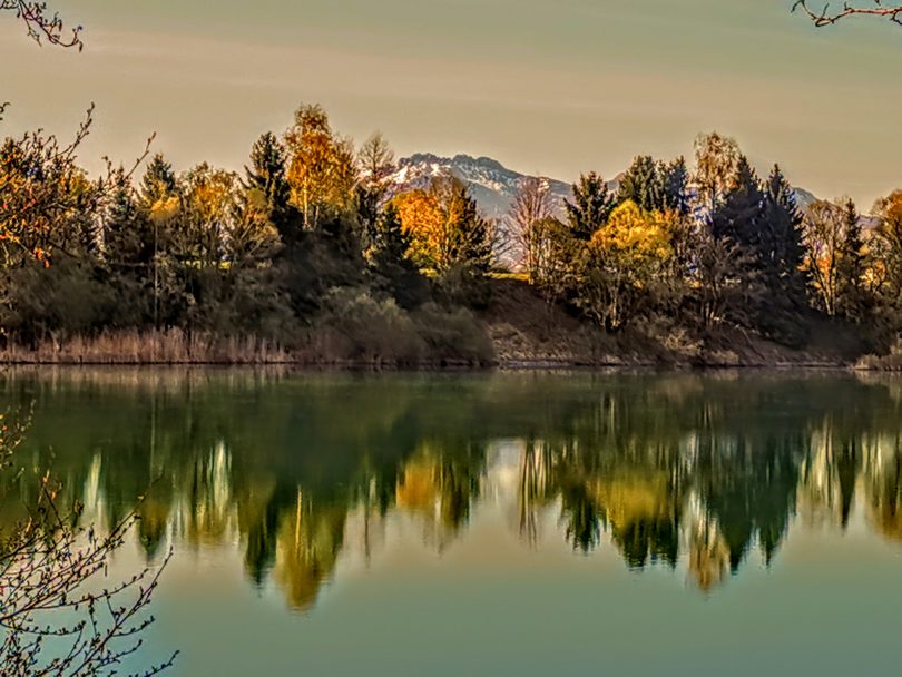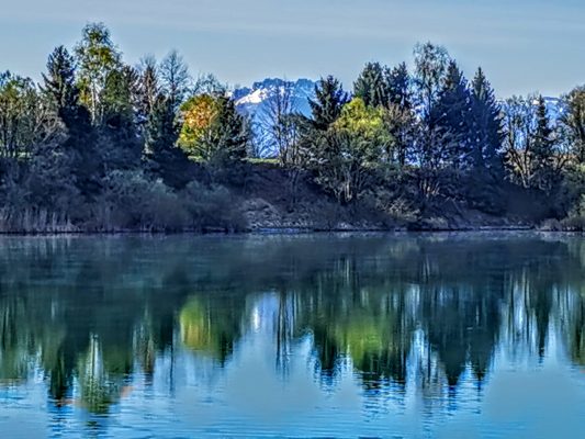 Ein besonderer Platz, um scöne Foto-Motive zu finden, ist die ehemalige Kiesgrube bei Eggstätt. Von dort geht bei günstiger Witterung und Sicht der Blick bis in die Chiemgauer Bergwelt – wie unsere aktuellen Bilder mit nahenWasserspiegelungen sowie mit der fernen Kampenwand zeigen.