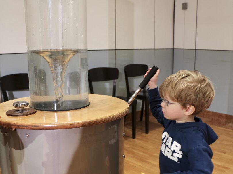 Bericht und Foto: Prien Marketing GmbH – 2018 waren nicht nur die kleinen Ausstellungsbesucher:innen fasziniert von dem Anblick eines Wasserstrudels. „Die Spiralbewegung ist eine der Urformen, die die Entwicklungsbewegung des werdenden Lebens ausführen“, erklärte ein Mitarbeiter von Schloss Freudenberg.