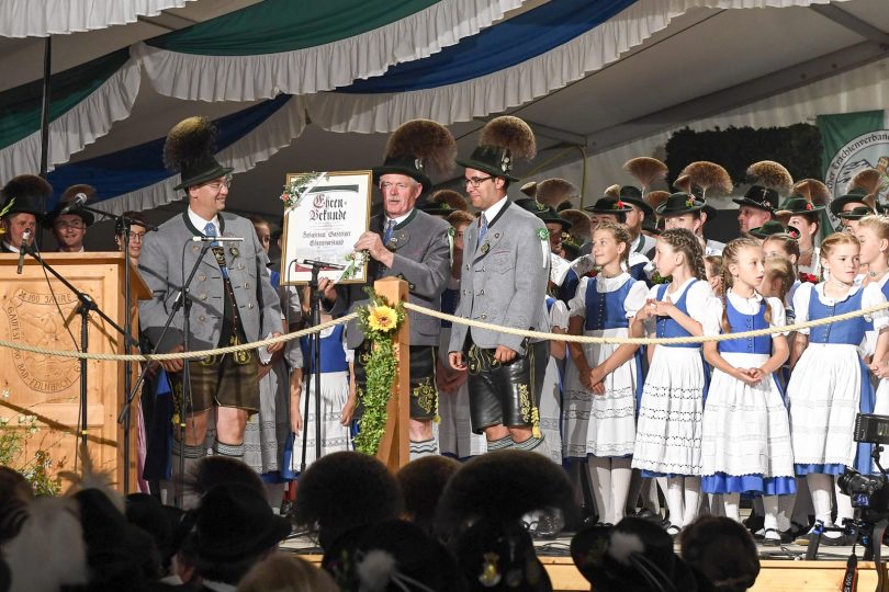 Den Festabend des Gaufestes nutzen die Jenbachtaler Trachtler als geeigneten Rahmen um Wast Gasteiger eine ganz besondere Ehrung zuteilwerden zu lassen: sie ernannten ihn zum Ehrenvorstand. Der Erste Vorstand Marinus Moser würdigte Gasteigers Verdienste um den Bad Feilnbacher Trachtenverein in seiner Laudatio. So hatte der eingefleischte Trachtler lange Jahre das Amt des zweiten und ersten Vorstandes des Vereins inne und wirkt seit einigen Jahren als Brauchtumswart im Vereinsausschuss mit. Bei zahlreichen Maibaumaufstellen übernahm Gasteiger die Organisation und das Kommando beim Aufstellen. Auch der Bad Feilnbacher Festwoche stand er oft als Festleiter vor. Überdies war Gasteiger auch der Festleiter des 100. Gaufestes, das 1990 in Bad Feilnbach gefeiert wurde. Mit stehenden Ovationen geleiteten die Festbesucher Wast Gasteiger auf die Bühne und applaudierten minutenlang. Sichtlich gerührt nahm der eben ernannte Ehrenvorstand die Urkunde aus den Händen von Festleiter und zweitem Vorstand Sebastian Gasteiger entgegen. Ihm zu Ehren spielte die Musikkapelle Bad Feilnbach den Marsch „D’Jenbachtaler“ aus der Feder von Alois Schmid. In seinen Dankworten schwörte Gasteiger auf die heilsame Kraft der Trachtensache: „Andere suchen einen Doktor auf oder nehmen Medizin. Ich geh zum Trachtenverein und den Trachtenfesten – das erhält mich aufrecht. Vergelt’s Gott!“.