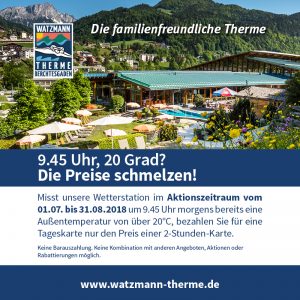 Ab Sonntag, den 1. Juli, startet die Watzmann Therme in Berchtesgaden wieder das beliebte Sommerticket. Das bis 31. August gehende Angebot beinhaltet eine Vergünstigung der Tageskarte bei hohen Außentemperaturen. Genauer reduziert sich der Preis der Tageskarte auf den Preis einer normalen 2-Stunden-Karte, wenn um 9.45 Uhr bereits eine Außentemperatur von über 20 Grad Celsius gemessen werden. Weitere Informationen gibt es unter www.watzmann-therme.de.