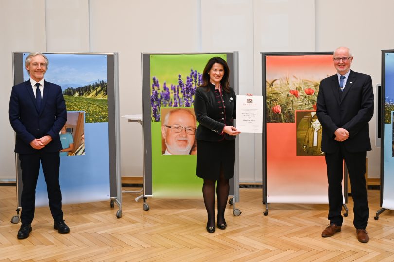 Für seine hervorragenden Verdienste um die Ländliche Entwicklung zeichnete die Ministerin den 65-jährigen Geierhos mit der Staatsmedaille in Silber aus. In ihrer Laudatio würdigte Michaela Kaniber ihn als Führungspersönlichkeit mit Weitblick, Verhandlungsgeschick und politischem Gespür. In den 21 Jahren als Leiter habe Geierhos wesentliche Entwicklungen und Modernisierungen in der Ländlichen Entwicklung trotz massiver Reformeinschnitte entscheidend mitgeprägt. „Mit dem Konzept der Integrierten Ländliche Entwicklung werden kommunale Allianzen aktiv begleitet und unterstützt, um vor Ort eine zukunftsorientierte und lebenswerte Region zu gestalten. Dieses Konzept ist eine Erfolgsgeschichte geworden, die ihres gleichen sucht und Sie haben maßgeblich an dieser mitgeschrieben“, sagte die Ministerin. In diesen Jahren sei auch die Dorferneuerung mit dem Schwerpunkt Innenentwicklung sowie die Förderung von Kleinstunternehmen zur Grundversorgung ausgebaut und die Initiativen boden:ständig und Heimatunternehmen auf den Weg gebracht worden. Mit seiner Arbeit in der Bund-Länder-Arbeitsgemeinschaft Landentwicklung habe sich Geierhos auch weit über die bayerischen Grenzen einen Namen und Bayern zu einem gefragten Partner gemacht.