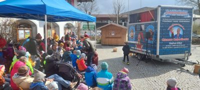 Und die Inszenierung hätte nicht besser sein können: Pünktlich zum Start gab es nicht, den vom Wetterbericht angekündigten Regenschauer, sondern tatsächlich Sonnenschein. Später übernahm dann der Zauberer die Wetterredaktion. Er wollte tatsächlich Regen zaubern, wobei zur Freude der Kinder nur Seifenblasen über den Rathaus-Platz wehten. Als dann Kasperl und Osterhase Mucki den Zauberstab erobert hatten, zauberten sie zum Happy End echte bunter Ostereier, die ihnen die Kinder förmlich aus den Händen gerissen haben.