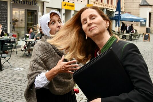 Unsere zwei Stadtführerinnen Dagmar Deisenberger und Karin Wiesböck nahmen uns mit auf die Reise durch das 16./ 17./ und 18. Jahrhundert. Sie brachten uns starke „Weiber“ aus Rosenheim näher, die in der Geschichte Rosenheims oftmals nur am Rande erwähnt werden. So wurde uns das Dasein der Franziska Rieder nahegebracht! Apothekersgattin, die in der Zeit als ihr Mann Georg Bürgermeister von Rosenheim die Stadterhebung vorbereitete, den Verkauf in der Apotheke übernahm und auch den heute noch bestehenden Kräutergarten im Rosenheimer Riedergarten anlegte und pflegte. Durch das schauspielerische Talent Dagmar Deisenbergers, konnten wir teilnehmen, wie Franziska Rieder mit ihren Kräutern ein „Zwiegespräch“ führte. Auch trafen wir Apolonia Papin, die uns ihr Leid klagte, da ihr Gatte ein Kloster im Salingarten bauen ließ und die Mönche vor der Fertigstellung des Gebäudes schon angereist waren und sie diese bei sich zu Hause verköstigen musste. Die Mildtätigkeit ihres Gatten versetzte sie immer wieder in Kummer.