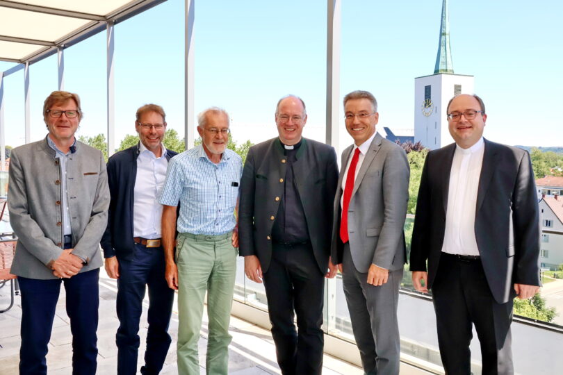 Landrat Otto Lederer begrüßt den Austausch und den guten Kontakt zu den kirchlichen Trägern. Der Weihbischof wurde begleitet von Pastoralreferent Franz Maier, Dekanatsreferenten Markus Brunnhuber, Sebastian Heindl, Geschäftsführender Dekan in Rosenheim, sowie von Landkreis-Dekan Klaus Vogl (von links). Für die Region stehen seitens des Bistums umfangreiche strukturelle Reformen an, der Landkreis Rosenheim ist davon besonders betroffen. Künftig soll es neben der pastoralen Grundversorgung vor Ort auch pfarrverbandsübergreifende Angebote, wie beispielsweise Jugend-, Kranken- und Altenseelsorge geben. Weihbischof Graf zu Stolberg ist dabei für die Südregion zuständig.