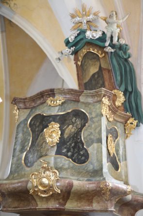 Akribische und konzentrierte Arbeit waren laut der beiden Diplomrestauratorinnen Ingrid Stümmer und Melissa de Pellegrin erforderlich, was Künstler vor Jahrhunderten für die Filialkirche in Adlberg geschaffen haben, um diese wieder herzustellen. Denn die Holzwürmer, auch Anobien genannt, haben hingegen an den wertvollen sakralen Kunstgegenständen in Adlberg über viele Jahre ganze Arbeit geleistet. Deshalb läuft parallel zur Restaurierung eine Schlupfwesten-Schädlingsbekämpfung. Gezielt werden die “Sparhius exarator”-Wespen an Stellen mit starkem Holzwurmbefall wie beispielsweise der Empore, aus Plastikröhrchen freigesetzt. Dort lähmen sie die Holzwurmlarven und legen ihre Eier darauf ab. Danach verlassen die Insekten die Kirche, ebenso wie der geschlüpfte Nachwuchs, weshalb über fünf Jahrte hinweg, von Mai bis September alle vier Wochen, neue Wespen ausgesetzt werden. Etwa 300 Euro kostet das Kunstreferat des Erzbistums München-Freising eine einzige Attacke auf den Holzschädling. Vor allem der Rokokoaltar, das Chorgestühl und die Kanzel bedurften dringend die fachmännischer Widerherstellung der letzten zwölf Monaten. “Schön, dass wir dazu unseren Beitrag leisten konnten”, sagte Stümmer. Wir waren bereits vor drei Jahren zu einer Voruntersuchung hier und es hat wirklich schlimm ausgesehen. Gerade der Anobienbefall (Holzwurm) war verherrend, vieles war am Zerbröseln”, berichtete die Diplomrestauratorin Melissa de Pellegrin. Besonders hebt Stümmer das aufwändig geschnitzte Chorgestühl hervor, das Rätsel aufgibt: Die damit geschaffene große Anzahl an Sitzplätzen für die Geistlichkeit verwaist üblicher Weise auf ein nahe gelegenes Koster. Wo dies gestanden haben könnte, kann heute allerdings niemand mehr sagen.