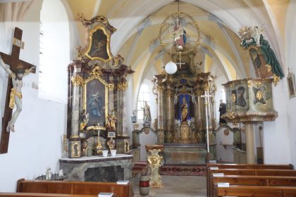 Die sehr aufwändig restaurierten Altäre und die Kanzel – eine äußerst wertvolle Ausstattung der Filialkirche Mariä Himmelfahrt in Adlberg, Gemeinde Inning am Holz wurden vom Kunstreferat des Erzbischöflichen Ordinariates aufwendig restauriert und am Montag, 15. August am Patroziniumstag vom Ruhestandspfarrer Johann Eschbaumer eingeweiht. Die Filialkirche Mariä Himmelfahrt in Adlberg ist ein spätgotischer Saalbau von 1476 und gehört damit zu den ältesten Kirchen im Landkreis Erding.