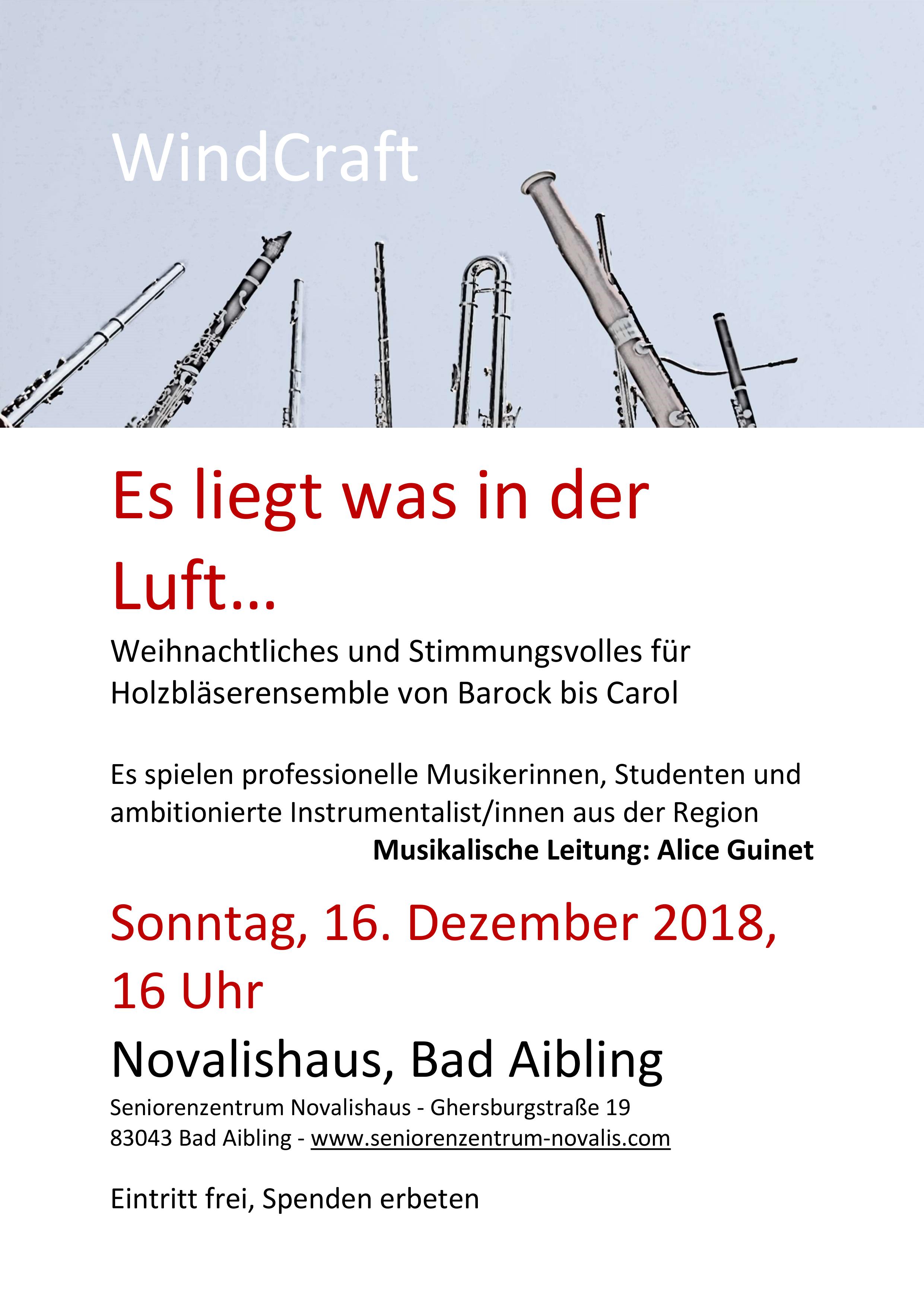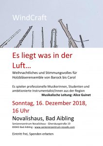 Das Ensemble Windcraft formiert sich aus professionellen Musikerinnen, (Musik-)Studenten und ambitionierten Instrumentalschülerinnen, die schon Erfahrung in den bekannten Rosenheimer Ensembles wie der Arche, der Stadtkapelle oder dem Symphonieorchester des Ignaz-Günther-Gymnasiums gesammelt haben. Auf der Suche nach einem gepflegten Holzbläserklang erklingen unter der Leitung von Alice Guinet stimmungsvolle Stücke in eigenen Arrangements: Barocke Festlichkeit aus Deutschland und Italien, Lieder und Carols voller Vorfreude aus England, Kanada, USA und der Ukraine – manches wohlbekannt, anderes etwas weniger…