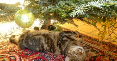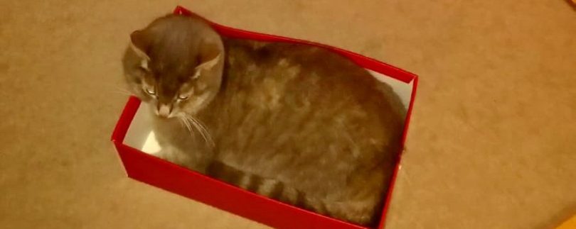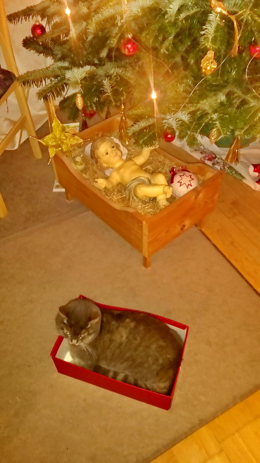 Wohlfühlmöglichkeiten gibt es zu Weihnachten nicht nur für das Jesus-Kind in der mit Stroh ausgelegten Krippe, sondern gleich daneben auch für diese Katze in einer leeren und engen Schuhschachtel – ganz nach dem Motto „Wo ich bin, da liegt es sich gut“.
