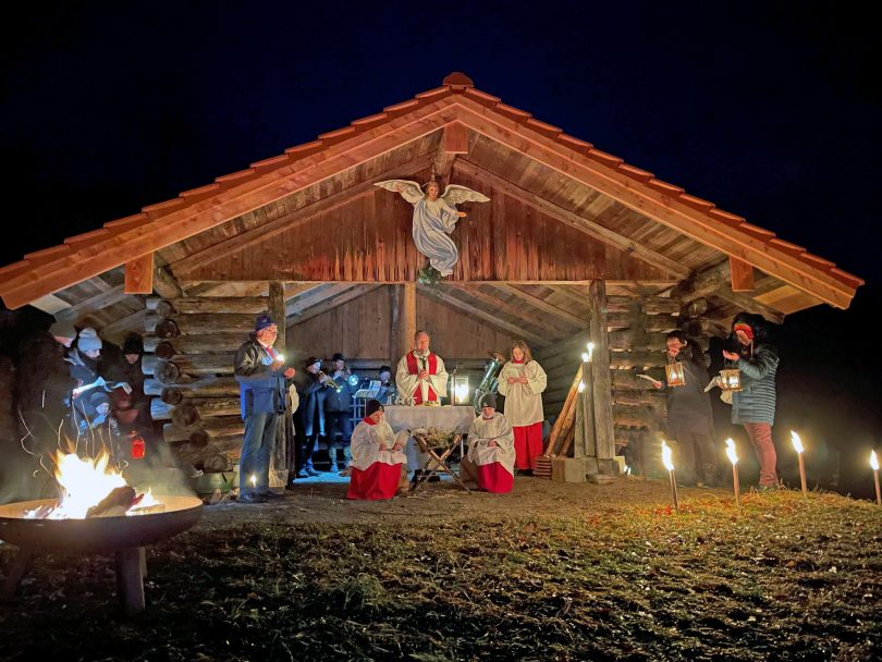 Einen weihnachtlichen Gottesdienst im Freien gab es am Stephanitag in der katholischen Pfarrgemeinde von Aschau „Darstellung des Herrn“. Pfarrer Paul Janßen hielt diesen oberhalb von Aschau am Stadel Oberweidachjörg und Richard Goßner hat dabei die Lesung vorgetragen. Bei Dunkelheit brachten die aufgestellten Fackeln, Feuerschale und mitgebrachte Laternen der Gottesdienstbesucher eine bilderbuchreife und strahlende Stimmung ab. Das in Stroh gebettete Jesuskind bewacht von den Ministranten und der angebrachte große Engel gaben dabei ein besonders beeindruckendes Bild ab. Die Hohenaschauer Bläser gestalteten die Feierstunde.