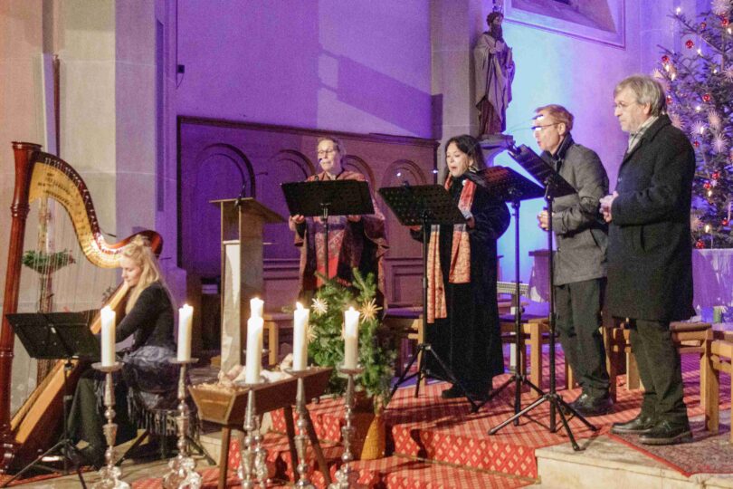 Bei der Begrüßung in der voll besetzten Riederinger Pfarrkirche sagte als Hausherr Pfarrer Claus Kebiner: „Gehen wir uns unseren Ohren auf eine große und wohltuende Reise, denn Musik ist Balsam für die Seele“. Alsdann begann die Reise durch Europa wobei typische Weihnachtslieder in den jeweiligen Landessprachen zusammengestellt und von den Künstlern selbst vorgestellt wurden. Dies wiederum – so die Moderatoren weiter – war gar nicht so einfach und so wurden eventuell anwesende Isländer, Dänen, Schweden, Norweger, Portugiesen, Polen, Franzosen, Spanier und Ukrainer um Nachsicht für etwaige regionale Dialekt-Unterschiede gebeten.  Eingerahmt wurden die Lieder von zauberhaften Harfenklängen sowie von prachtvoller Musik für Orgel und Posaune. „Weihnachten mit seinen Liedern verbindet uns Menschen, ob jung oder alt, auf der ganzen Welt und versetzt uns alle in eine ganz besondere Stimmung“ – mit diesem Stimmungsbild und mit der Bitte, ganz besonders den vom Krieg geschundenen Menschen in der Ukraine in der Musik, im Geiste und im Gebet verbunden zu sein, schickte Pfarrer Kebinger dann die Mitwirkenden auf ihre Reise durch Europa.  Zum Abschluss gab es reichlichen Applaus ebenso wie eine dankbare Nachdenklichkeit. Dankbar  und beeindruckt zeigte sich auch Neukirchens Kirchenpfleger Heinrich Dhom, er hielt seine Eindrücke wie folgt fest:  „Für mich beeindruckend, eher beklemmend war am Schluss das Weihnachtslied aus der Ukraine und das Gebet für den Frieden, der nötiger ist als je zuvor“.